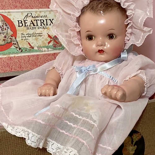 Ideal advertised this doll as "A popular new baby princess in doll form! Here is a doll that is truly a baby doll. It has the softest and cuddliest body that Ideal has ever produced -- Beatrix's arms and legs are so jointed that they will fall backward or forward just like those of a real baby -- her tiny fists are clenched like the fists of a newborn baby. Princess Beatrix can sit up or lie down, just as a real baby would in any pose, with one foot in her mouth or with her hands beneath her head -- or almost any other position a baby can take."